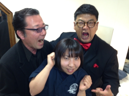 ちゃんと笑顔で真っ直ぐ立っていたのに、二人に脅されて体勢が崩れてしまいました。
