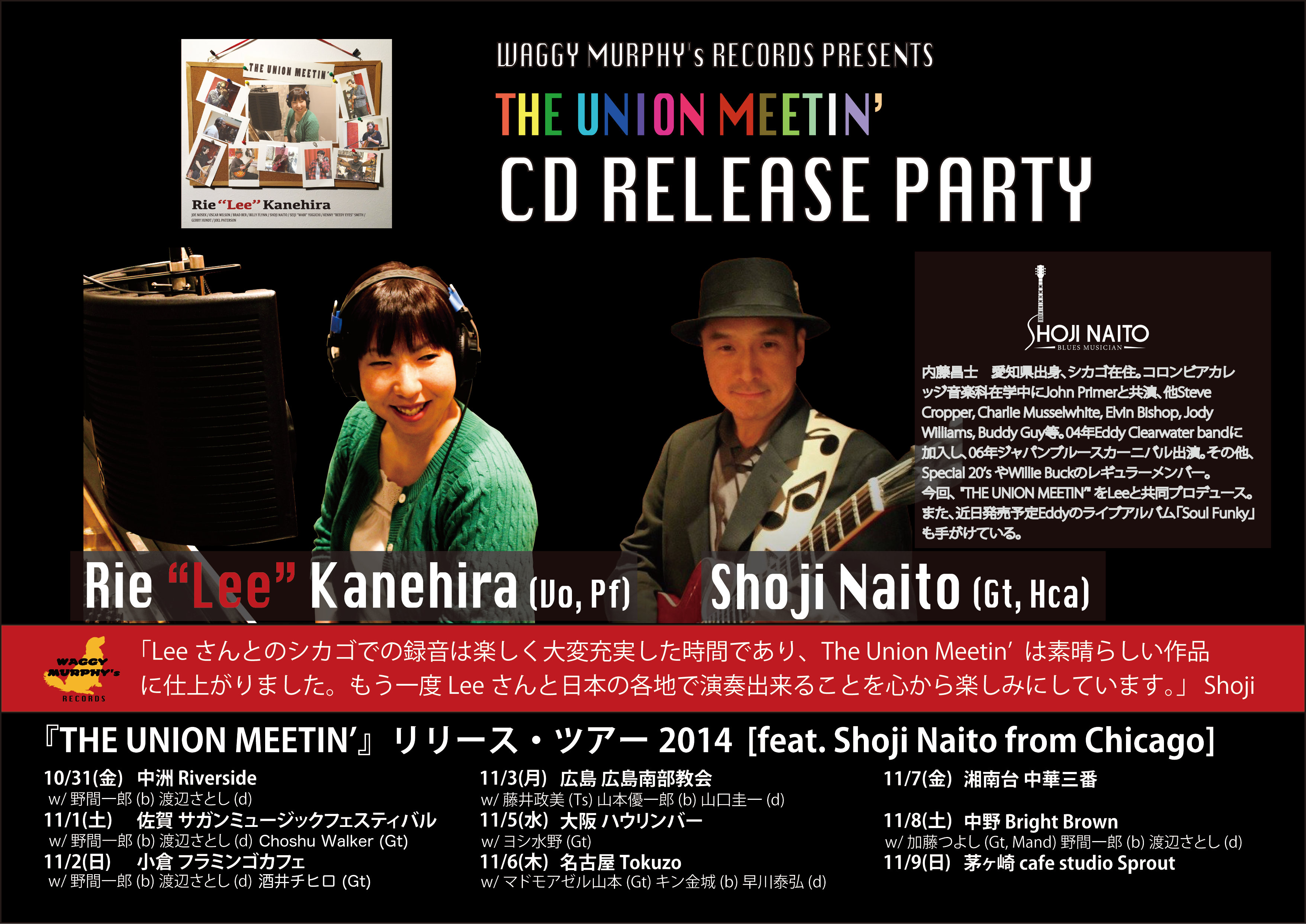 7月に発売したアルバムTHE UNION MEETIN’ のプロデュース&録音に参加してくれたシカゴ在住のShoji Naitoさんが帰国、一緒にツアーを行います! 各会場ごとに色んなミュージシャンとコラボしたり、デュオでやったりします♪