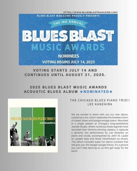 Voting is now open for the 2025 Blues Blast Music Awards, and we’re thrilled to announce that Miss Lee Kanehira’s album, Chicago Blues Piano Trio!!, has been nominated in the Best Acoustic Blues Album category!